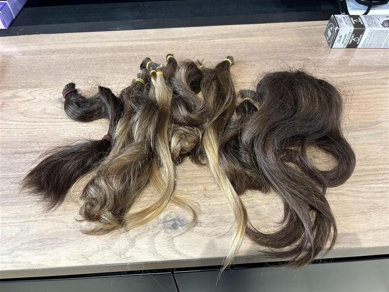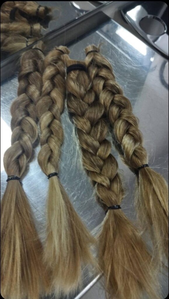 -JB : Il faut qu’il y ait un peu de longueur, entre 20 et 30 cm. Les cheveux coupés sont conditionnés en queues de cheval de 30 cm ou plus et sont envoyés au salon Shop my coif, dans l’Ain qui les adresse ensuite à un perruquier en Italie. Les plus courts (pas moins de 10 cm) partent à l’association Princesse Paloma dans les Alpes-Maritimes (qui a initié il y a 5 ans la fabrication de perruques en cheveux naturels, destinées aux enfants malades, ndlr).