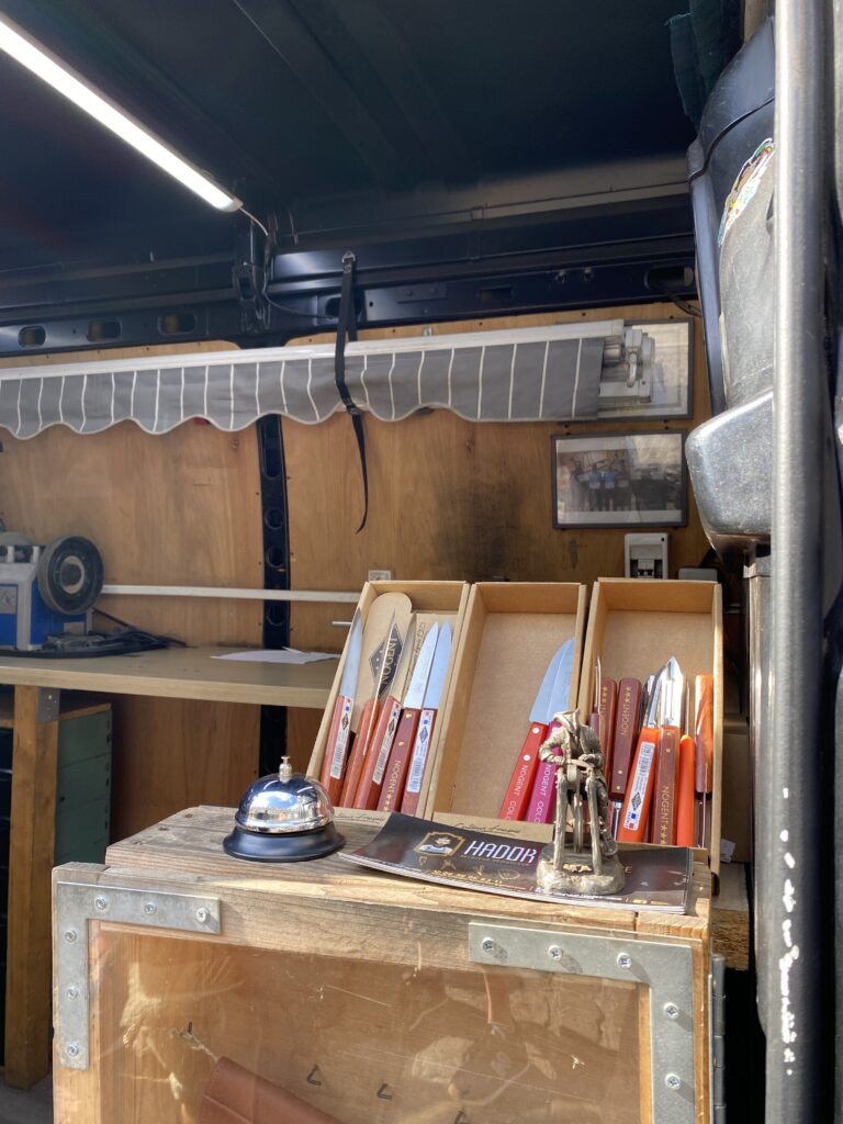 Sa formation terminée et son diplôme en poche, Thomas a élaboré son projet avec l’aide de ses proches. Il s’est mis ensuite mis à sillonner les routes des Hauts-de-France, choisissant en priorité les marchés de la région. Le succès est au rendez-vous, les rencontres se multiplient avec les clients qui désormais privilégient la conservation de leurs outils et instruments, séduits par la dimension économique et éco responsable. Thomas a d’ailleurs été sollicité par la CMA HDF dans le cadre du label Répar’acteurs qui permet aux artisans de se positionner en tant qu’acteurs du développement durable et de l’économie circulaire pour en finir avec le réflexe du « tout jeter ». Les besoins sont réels également auprès des professionnels (bouchers, restaurateurs…) qui ont un besoin régulier d’affutage de leurs outils de coupe.