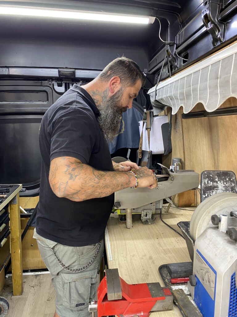 « Qu’est-ce qui fait un bon couteau ? Un bon acier et un bon manche, c’est aussi simple que ça » résume celui que l’on surnomme familièrement Hadok, parce qu’il est le capitaine « fort en gueule » de son équipe de foot. A le voir tellement à l’aise devant la meule de son camion, transformé en atelier mobile, sur le marché d’Arras, difficile d’imaginer que ce grand gaillard tatoué était encore, il y a un peu plus de quatre ans, mécanicien de maintenance dans une usine automobile à Nœux-Les-Mines. Thomas Defontaine a changé totalement de vie à la suite d’un reportage télé consacré à un artisan rémouleur. Une révélation. « J’ai su immédiatement que cela me conviendrait ! » Après s’être renseigné auprès de CMA Formation et Entreprises Béthune, sur la formation la plus adaptée, Thomas obtient une rupture conventionnelle auprès de son employeur et décide de partir en septembre 2021 apprendre le métier dans la seule école d’affûtage et de rémoulage d’Europe : FCTV, située à Beaumarchés à proximité de Plaisance du Gers.
